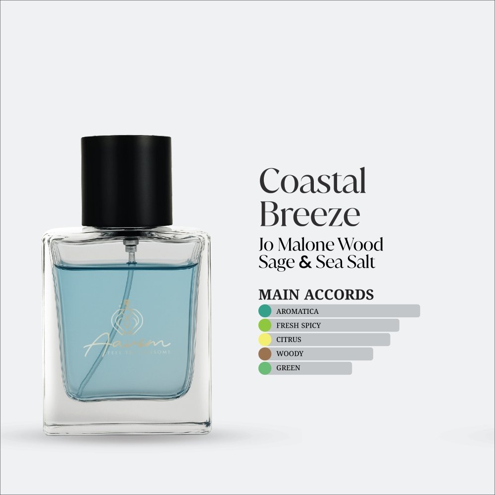 Inspired by JO MALONE WOOD SAGE & SEA SALT, Coastal breeze is suitable for both men and women. This vibrant citrus-aromatic scent embodies the essence of ocean air and sun-kissed beaches. It starts with vibrant neroli and yuzu that make you feel as though the sea air is caressing your skin. Anchored by the clove and sandy whispers, the fragrant notes of pink pepper, thyme, and rosemary add warmth. The aroma leaves a clean, revitalizing trail after settling to the gentle base of cypress. It is an experience rather than merely a fragrance. No matter where you are, you can experience the beach thanks to its fresh, smokey, musky, and marine scent. Take in every drop of the coastline.